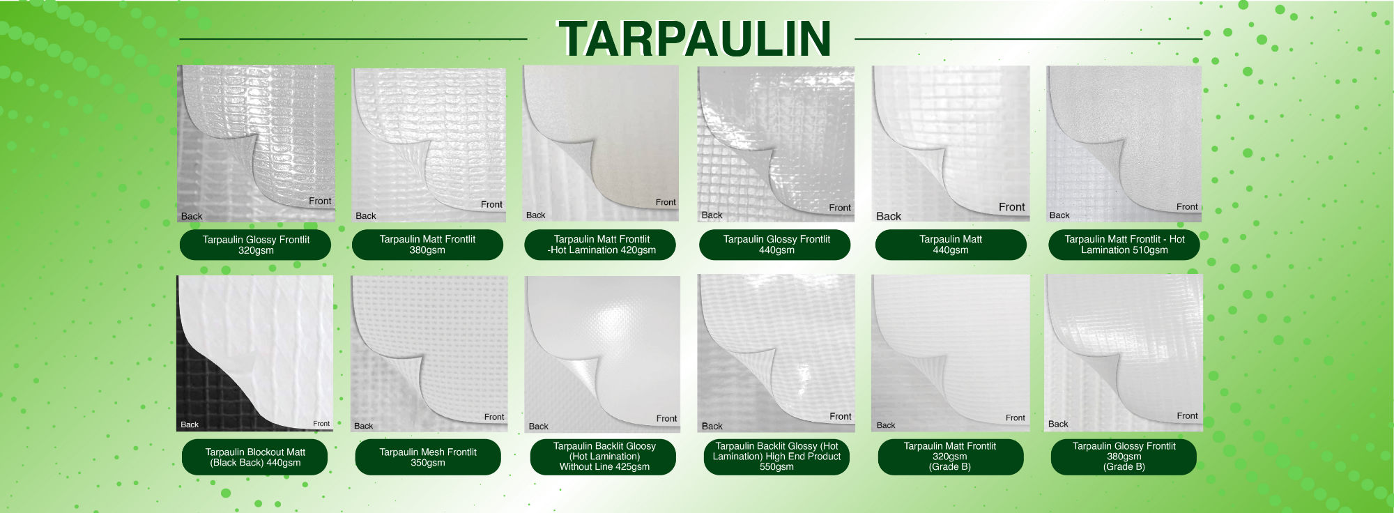We offer a wide range of products which include PVC Flex Banner/Tarpaulin, PP Synthetic Paper, White/Transparent Vinyl Sticker, Bubble Free Car Wrapping Sticker, Backlit Sticker, PET Backlit Film, Composite PET Film Banner, One Way Vision (Proferated Sticker), Art Canvas, Lamination, Fabric, Static Cling (Road Tax Sticker), Display System and Tools & Accessories. Please refer to our product range for details.